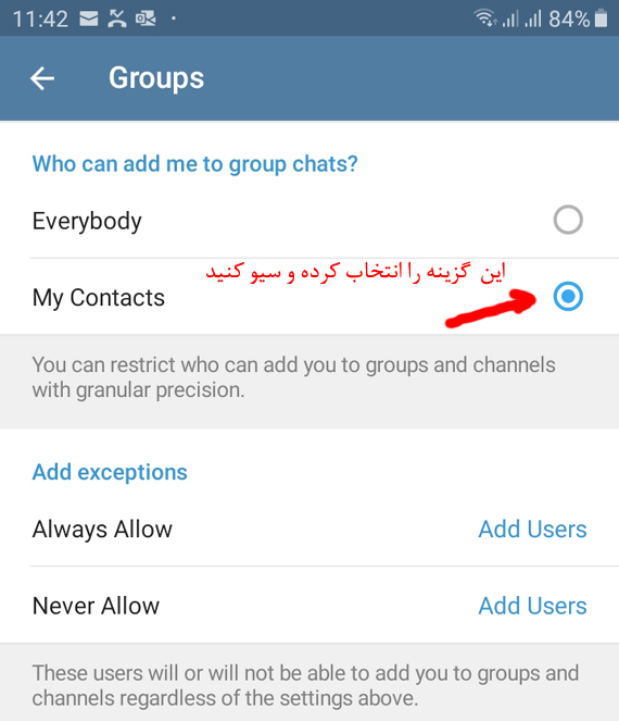 فرد غریبه ای در تلگرام قادر به اضافه کردن شما به گروه های مختلف نخواهد بود.