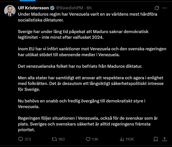 استکهلمیان— نخستوزیر سوئد، اولف کریسترسون، در واکنش به تحولات اخیر ونزوئلا